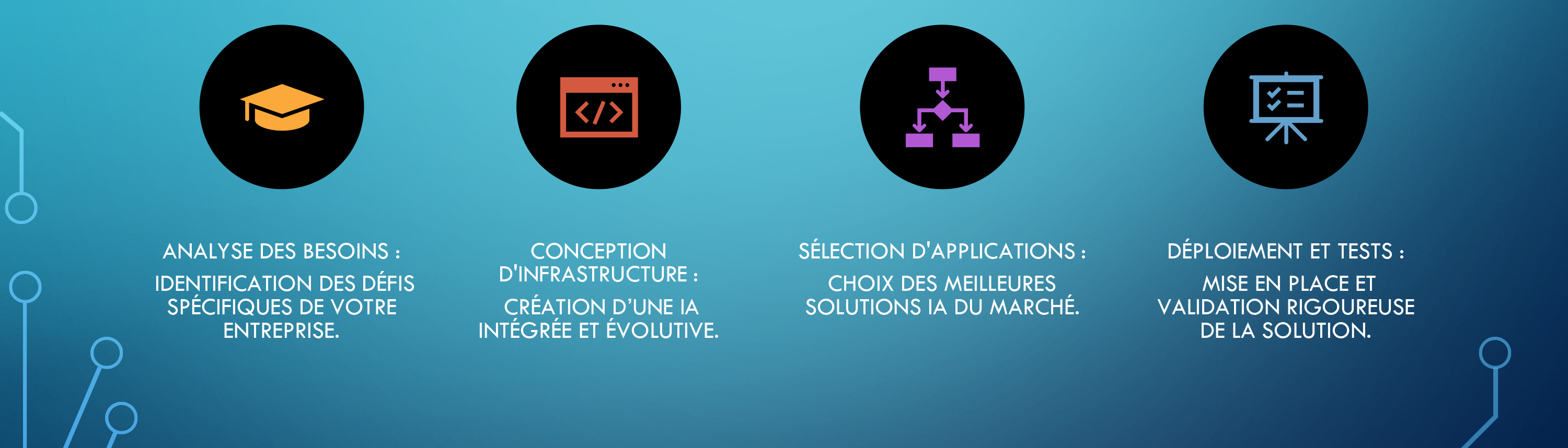 - Sélection d'Applications : Choix des meilleures solutions IA adaptées à votre entreprise. Notre IntelliLab IA a travaillé sur de nombreux prototypes afin de tester les app et solutions opensource et propriétaires disponibles sur le marché qui évolue chaque jour.