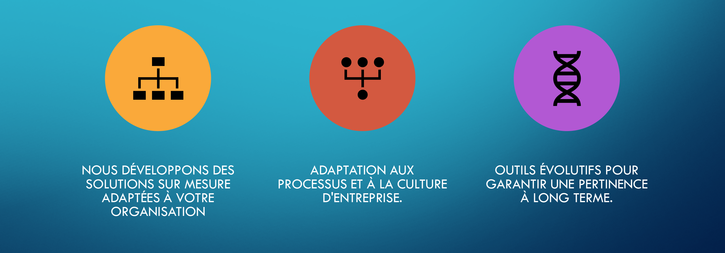 - Nous ne nous contentons pas de fournir des solutions prêtes à l'emploi. Nous développons des systèmes dédiés qui sont entièrement adaptés aux processus et à la culture de votre organisation. Notre objectif est de créer des outils qui non seulement répondent à vos besoins actuels mais qui sont également conçus pour évoluer avec votre entreprise.