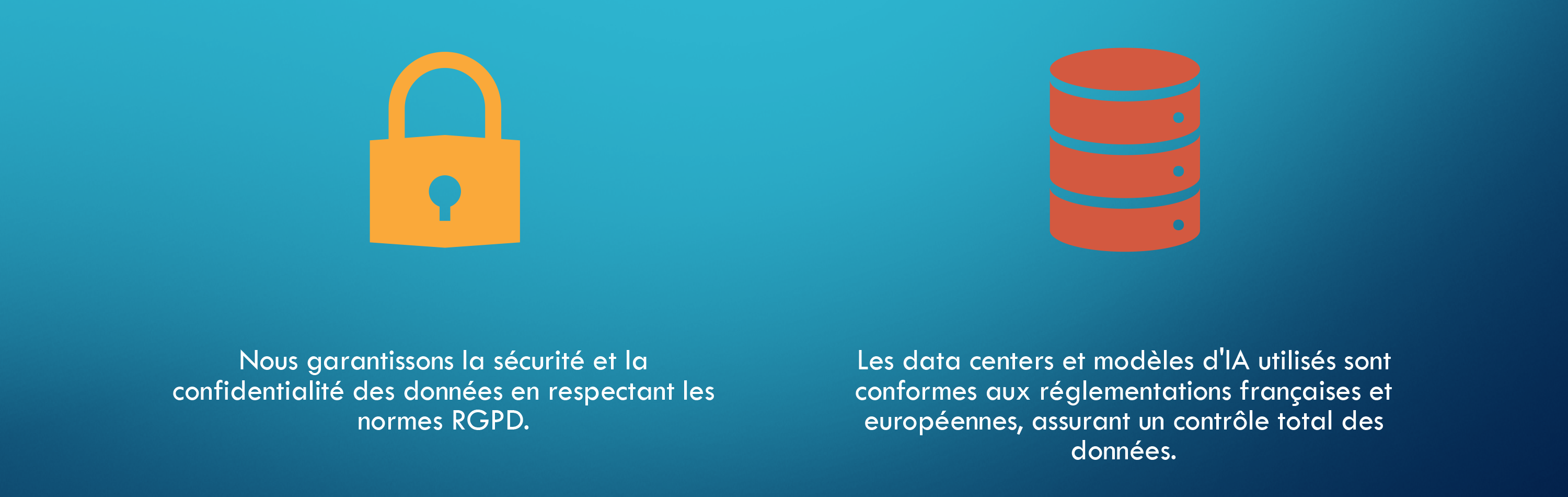 Nous proposons des solutions en conformité légale avec l'IA Act en France et UE, afin de garantir un hébergement propriétaire et sécurisé pour vous permettre d'avoir la pleine souveraineté sur les datas de l'entreprise. Conscients de l'importance de la souveraineté des données, nous veillons à ce que les data centers et les modèles de langage à grande échelle (LLM) utilisés soient conformes aux réglementations françaises et européennes. Cela vous assure un contrôle total sur vos données et leur traitement.